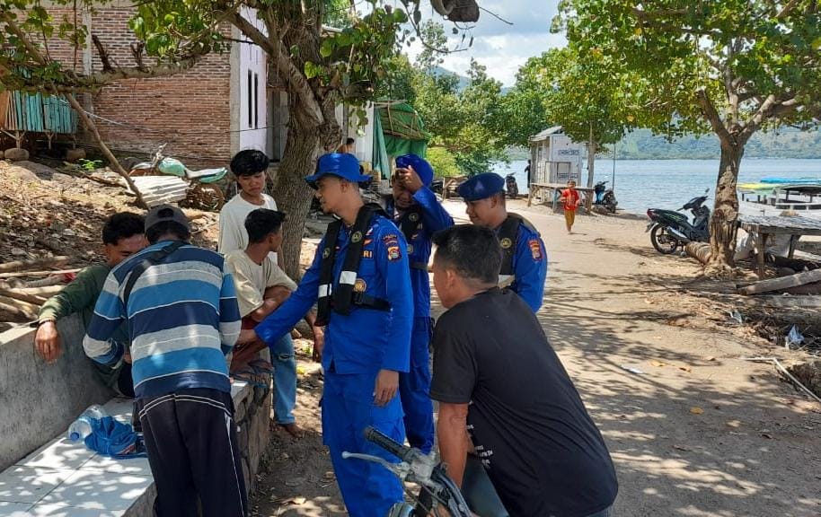 Terlihat sejumlah personel Satpolairud berdialog dengan warga serta nelayan di dermaga penyeberangan desa Punti Kecamatan Soromandi Kabupaten Bima.