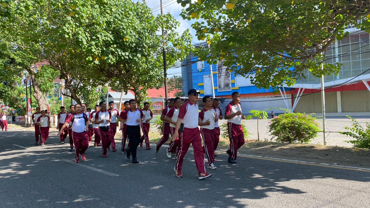 Kegiatan olahraga ini dipimpin langsung oleh Wakapolres Bima Kota Kompol Herman, S.H., didampingi para Pejabat Utama (PJU) Polres Bima Kota, dengan rute lari mengelilingi Taman Ria Kota Bima. Cuaca cerah dan udara pagi yang segar semakin menambah semangat para personel yang tampak antusias mengikuti kegiatan tersebut.